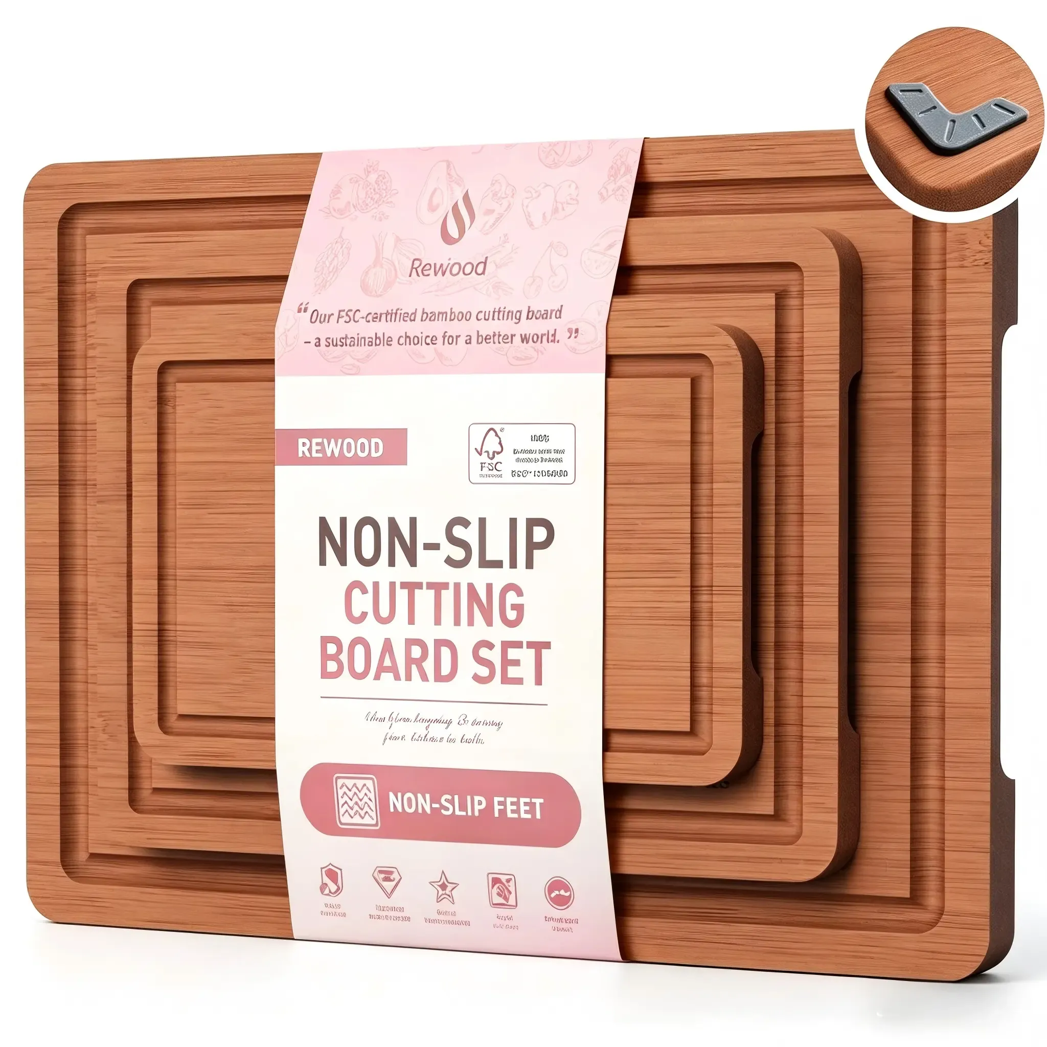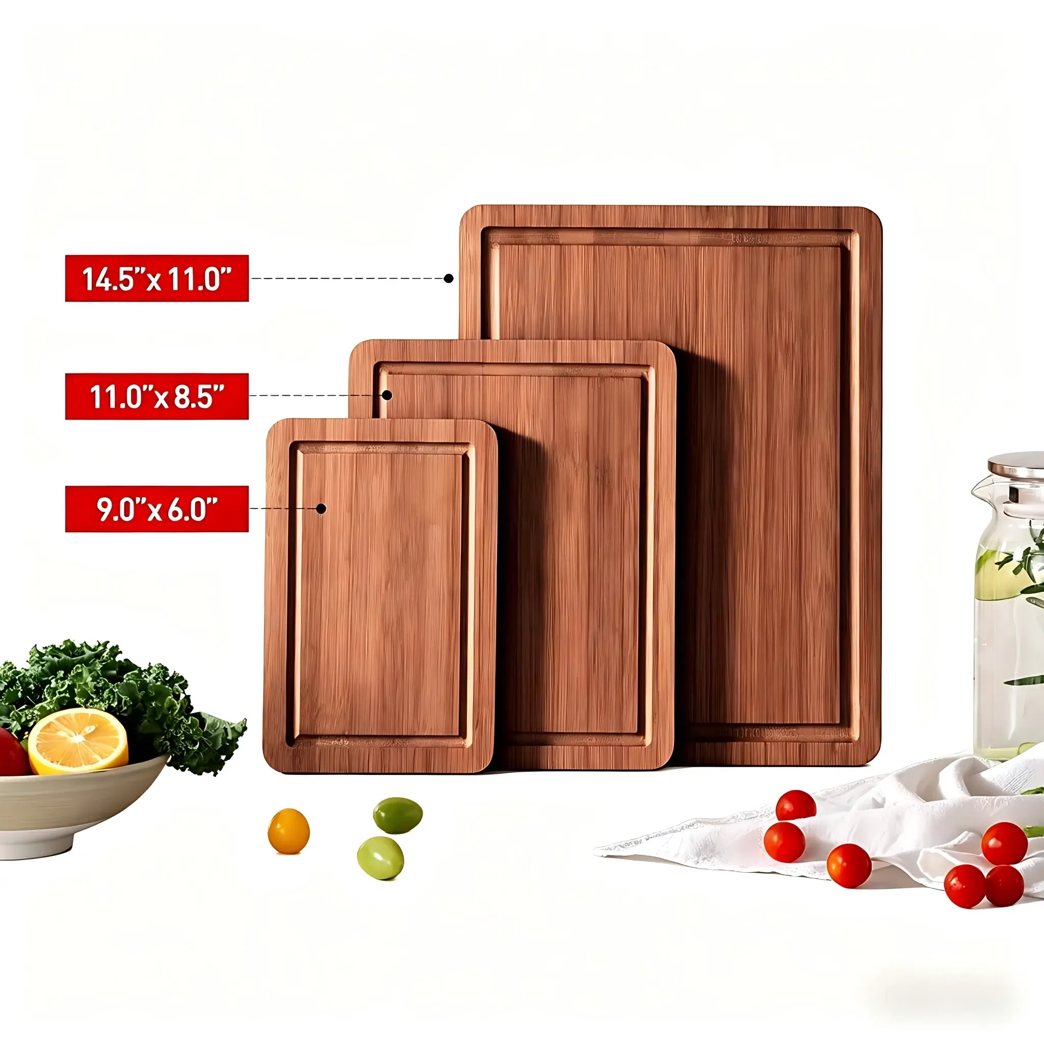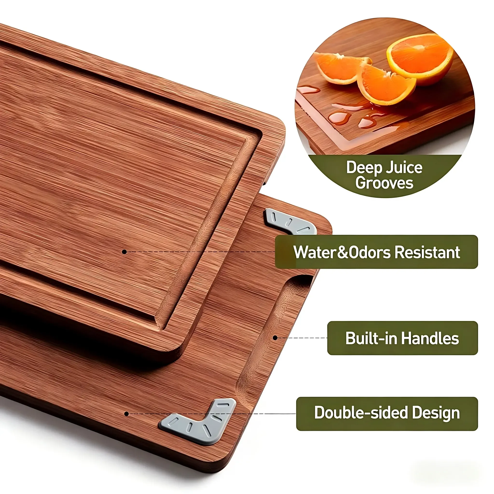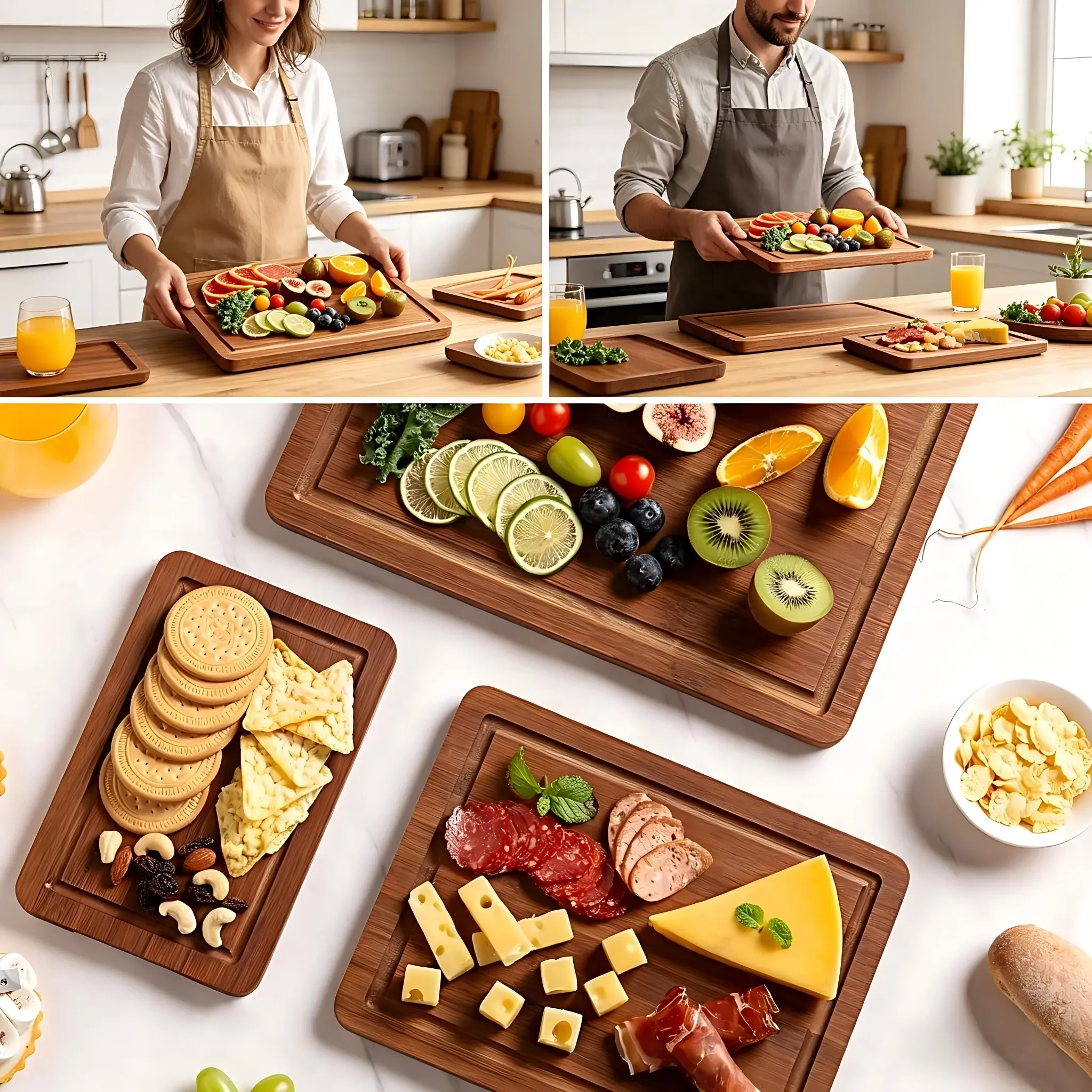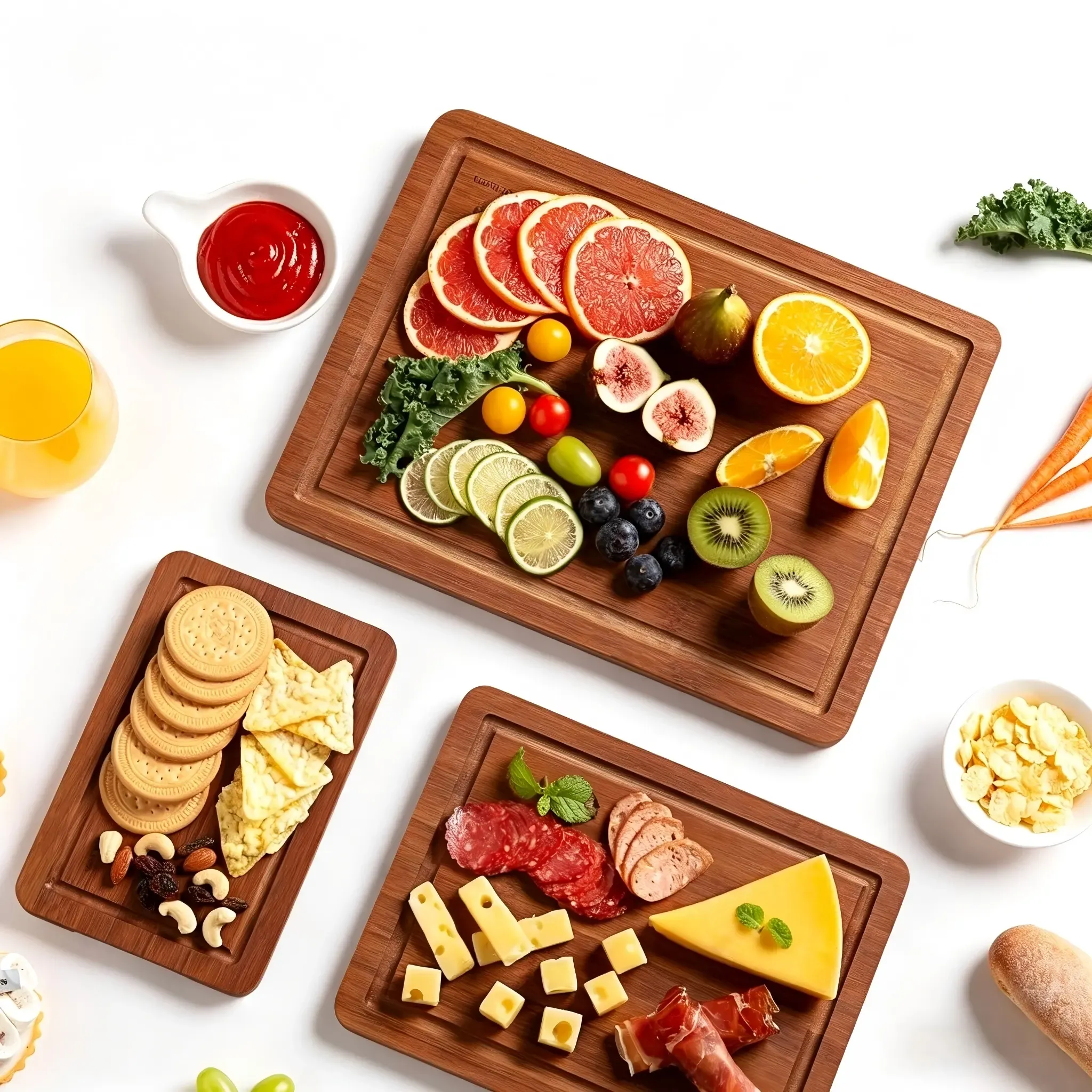 The set features a clean natural appearance and a simple functional design that works well for daily kitchen use. Functional details such as the deep juice groove and easy-grip handle help improve convenience during food preparation and serving, making the boards suitable for modern kitchenware assortments and e-commerce product lines.