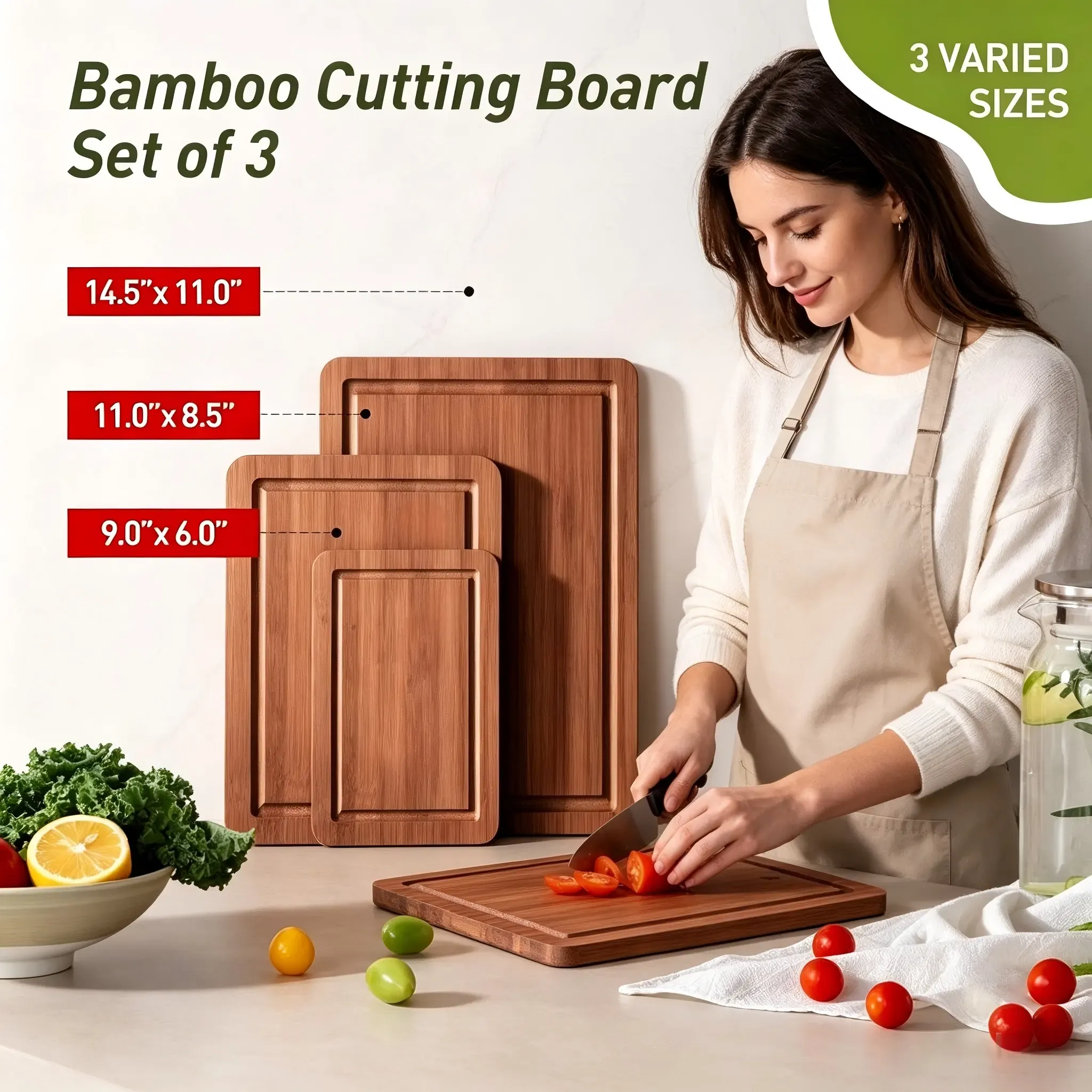 Practical 3-piece bamboo cutting board set for private label kitchenware brands, importers, wholesalers, retailers, and OEM sourcing projects. Suitable for kitchen prep, serving, retail-ready collections, and customized packaging programs.